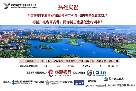 2025年1月15日,市城投集團(tuán)在中國(guó)銀行間交易商協(xié)會(huì)成功發(fā)行“陽(yáng)江市城市投資集團(tuán)有限公司2025年第一期中期票據(jù)”。本期債券發(fā)行規(guī)模為6億元,期限為3年,票面利率2.15%,全場(chǎng)倍數(shù)超過3.1倍,合計(jì)申購(gòu)機(jī)構(gòu)數(shù)23家。本期債...